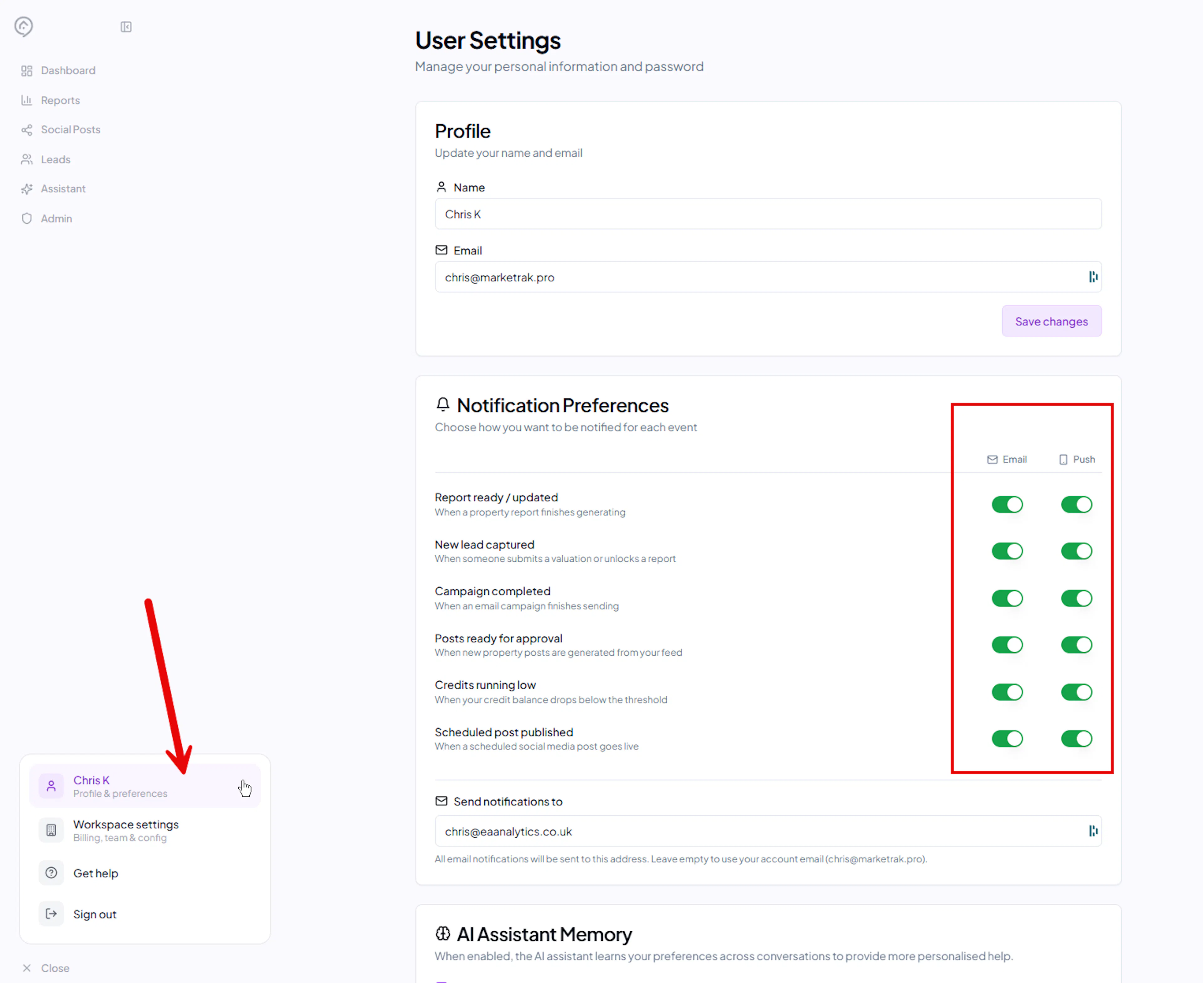 Your workspace is your agency's home in Market Trak. Head to Workspace Settings (click your profile icon in the sidebar) and configure: