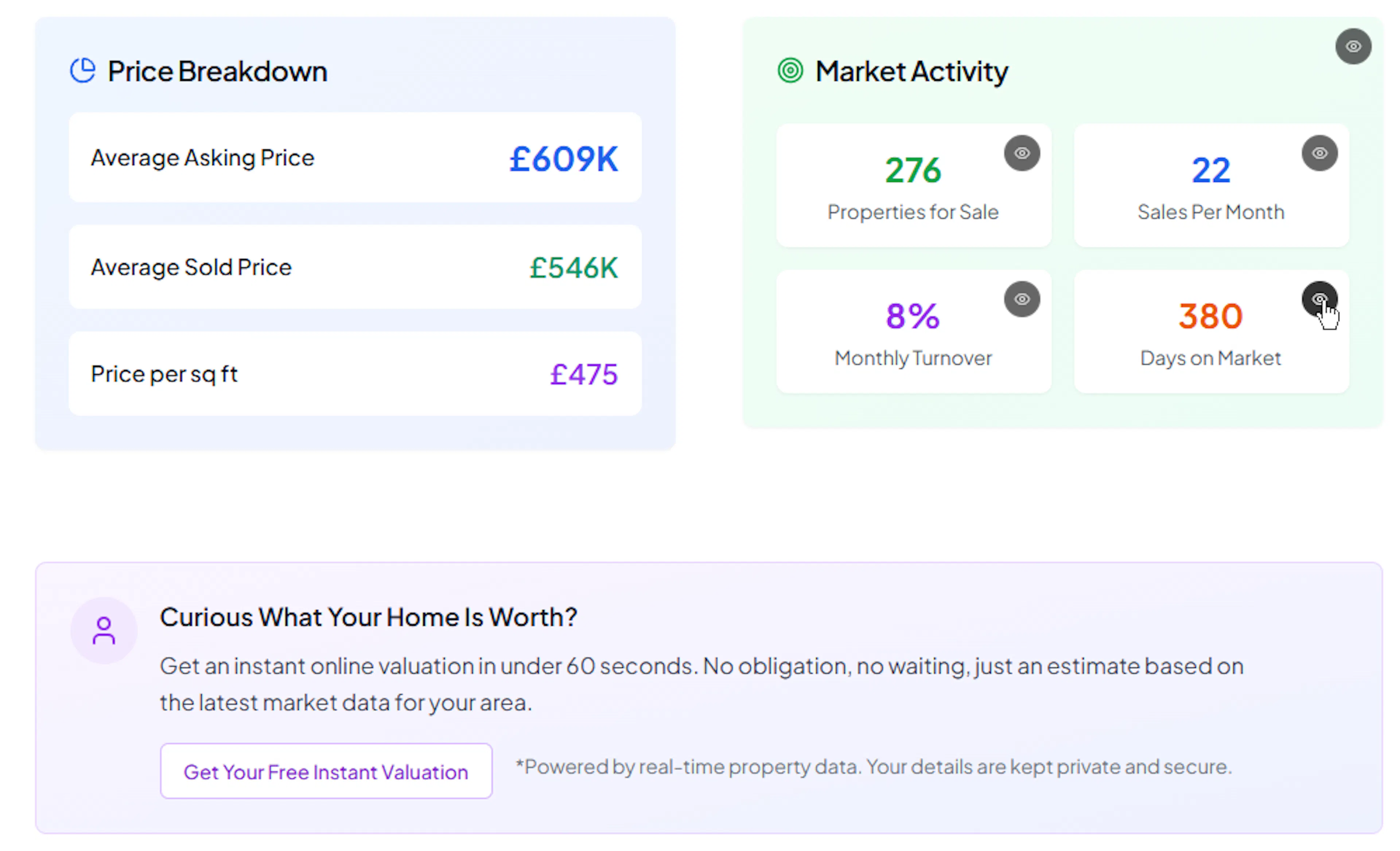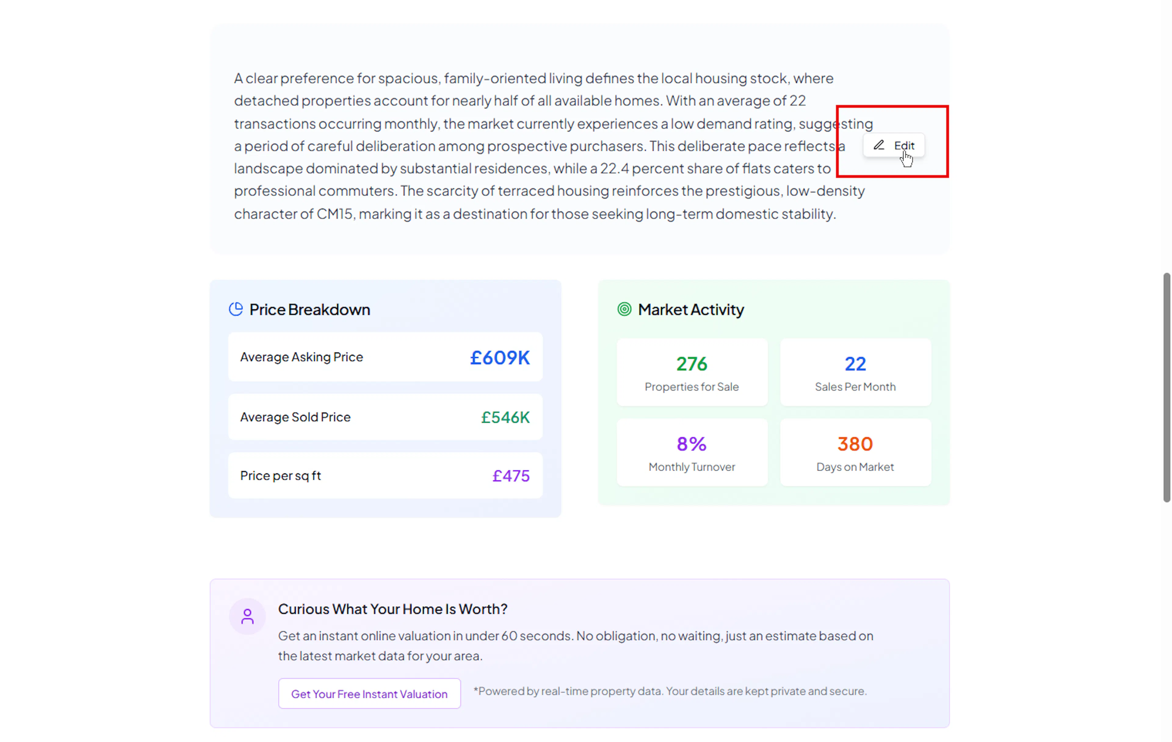 Sellers Guide - entire sections, plus individual Market Trend, Market Demand, and Average Price cards