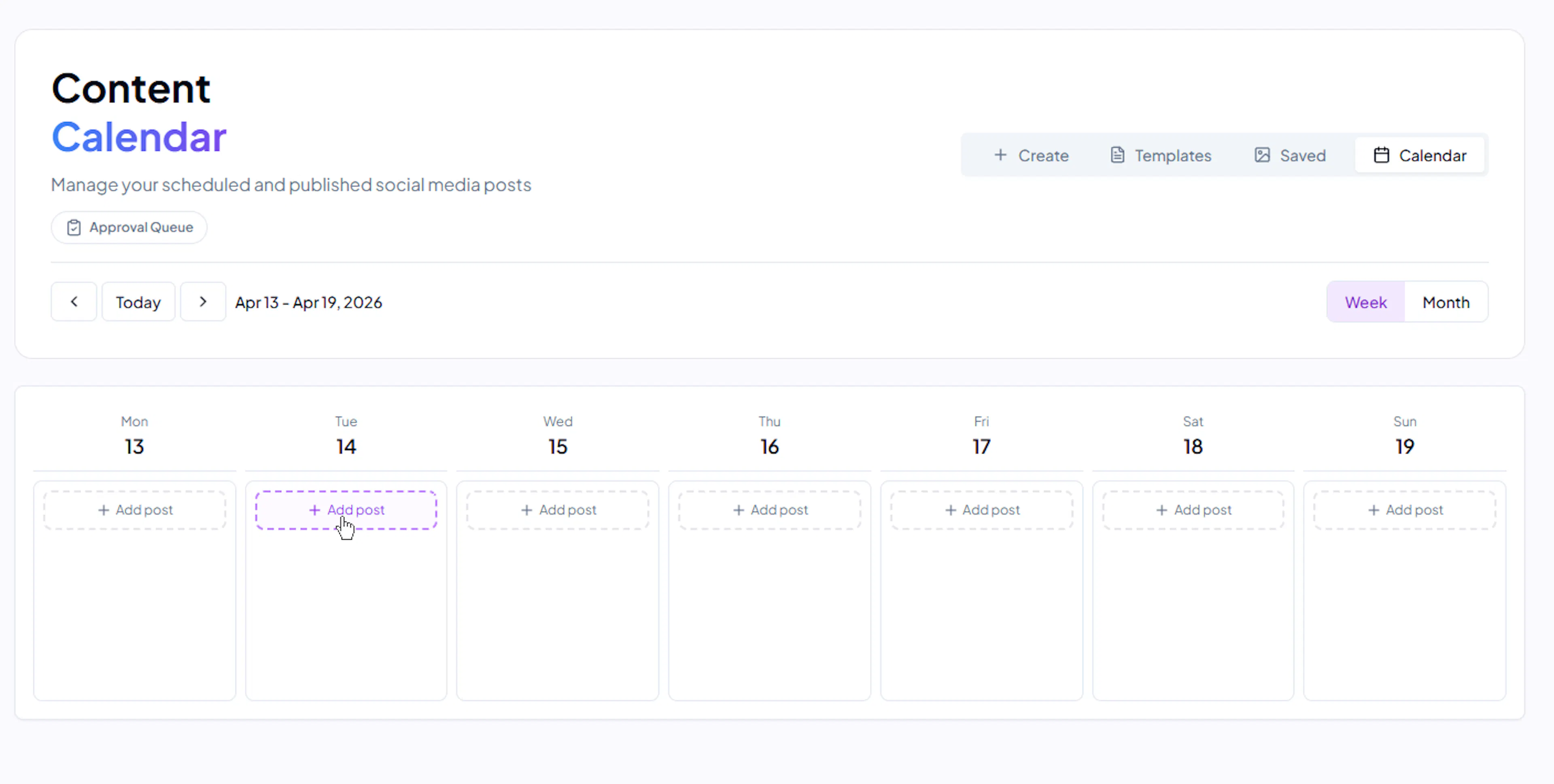 Content Calendar - click any day on the calendar to create a post directly (see Creating from the calendar)