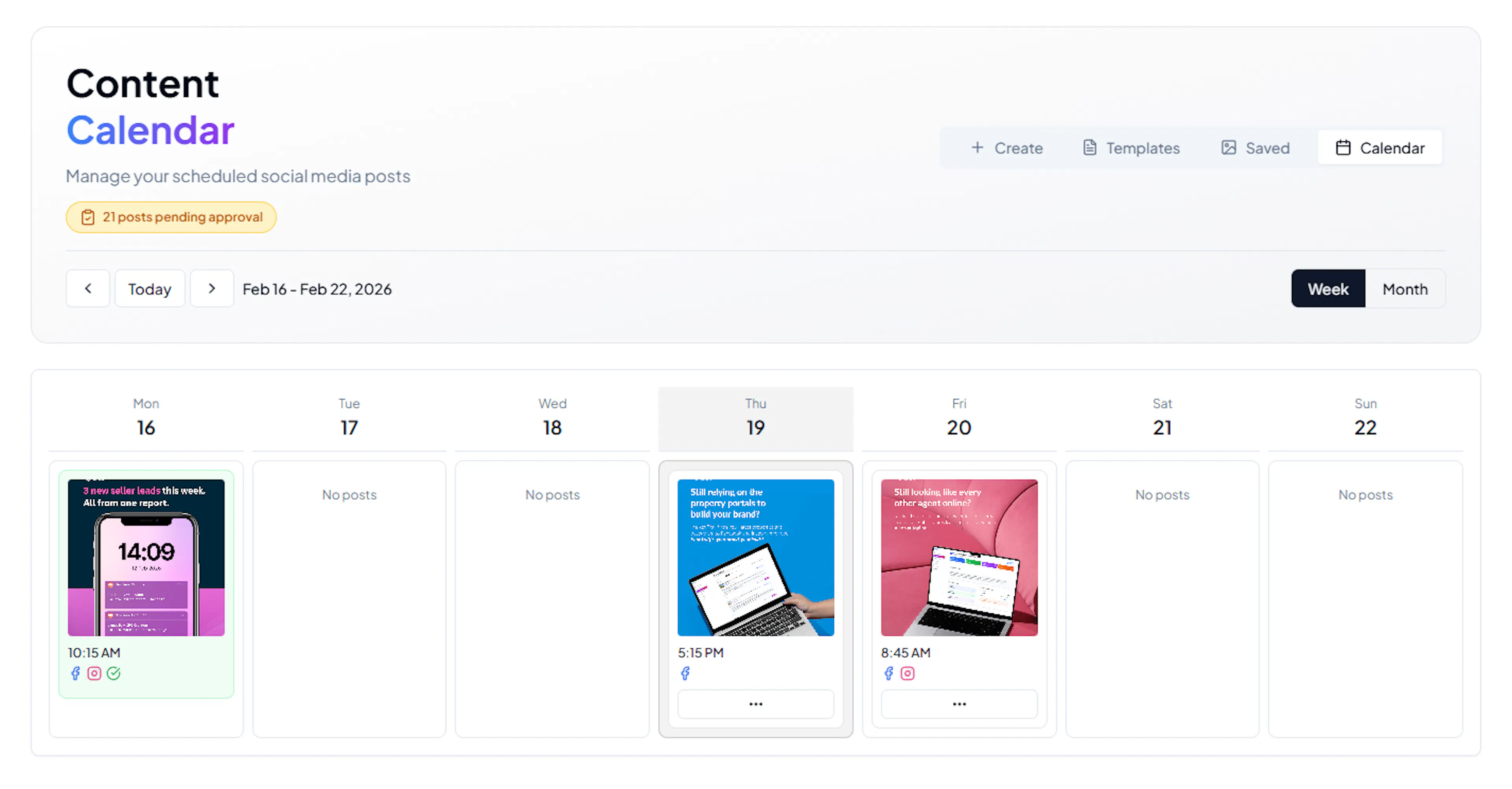 The Social Posts page shows your upcoming and past posts in a calendar view. Each day shows: